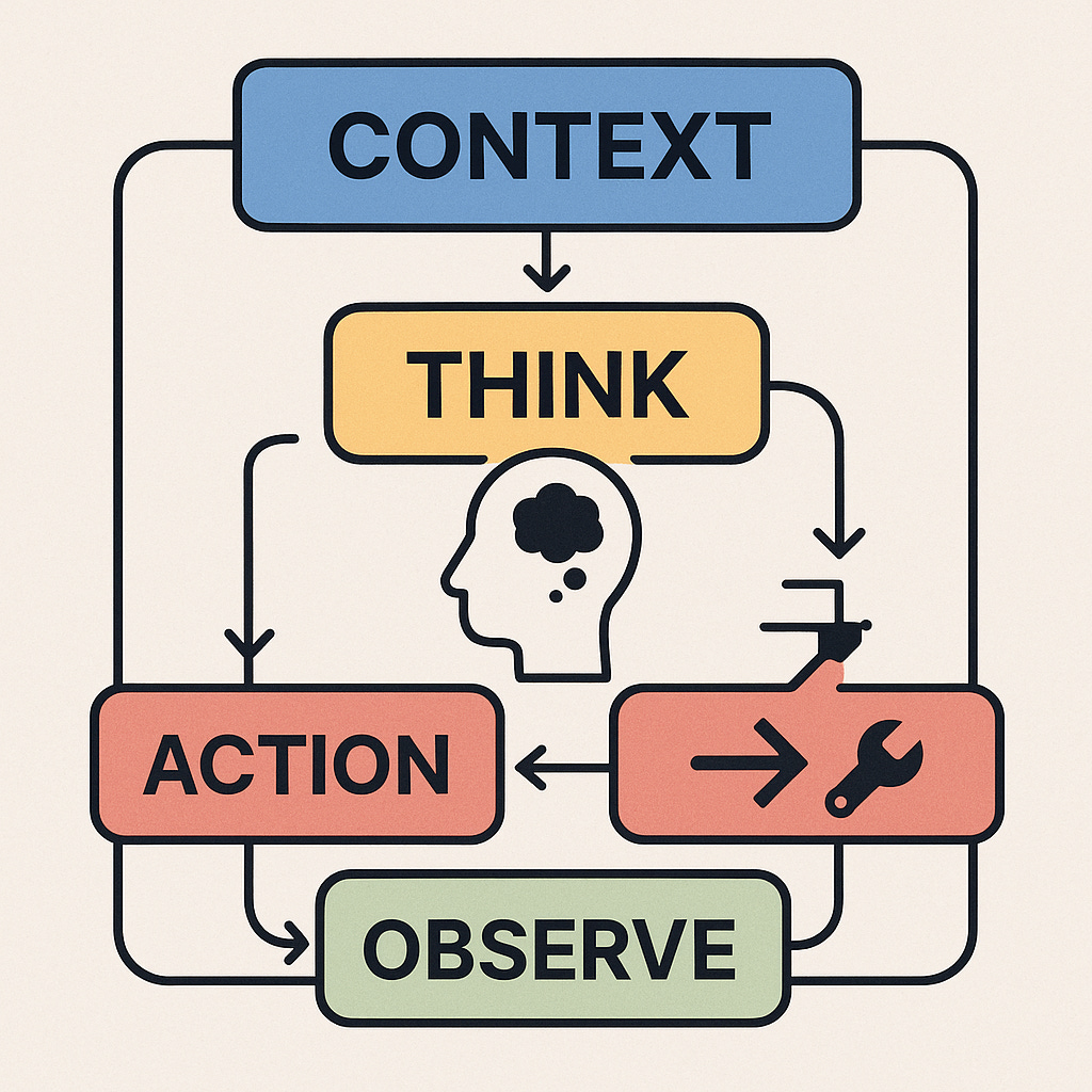 The basic structure of a ReAct agent is quite simple. It takes a Context (Query, Problem) and runs a Think, Action, Observe loop until it achieve the desired outcome.